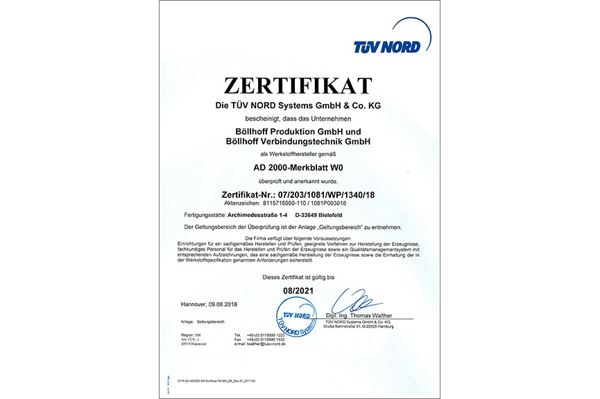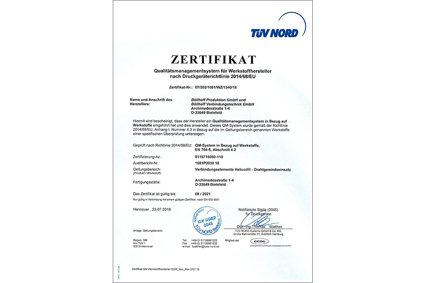 Zertifikate und Standards Qualitätsmanagementsystem für Werkstoffhersteller nach Druckgeräterichtlinie 2014/68/EU (BPR & BVT, Bielefeld)